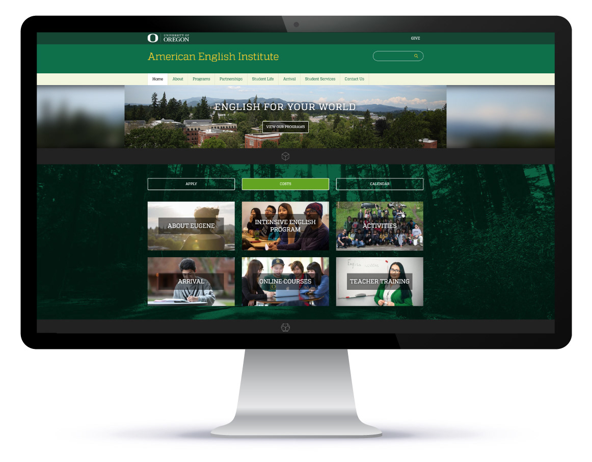A particularly fun challenge was rolling out a brand new website for the American English Institute at the University of Oregon. It needed to align with new branding criteria, but was also an opportunity for us to redesign the experience to lean more on interactive, visual elements and icons for the young, non-English-speaking audience we wanted to engage.